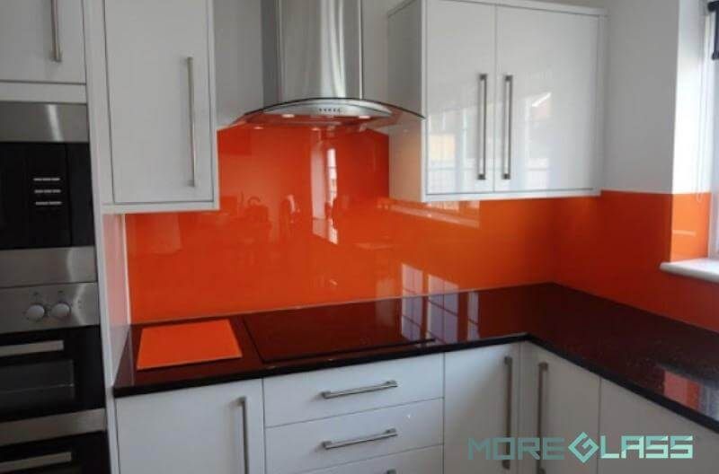 Ấn tượng với mẫu kính ốp bếp cường lực màu cam rực rỡ trẻ trung, phù hợp với phòng bếp phong cách hiện đại