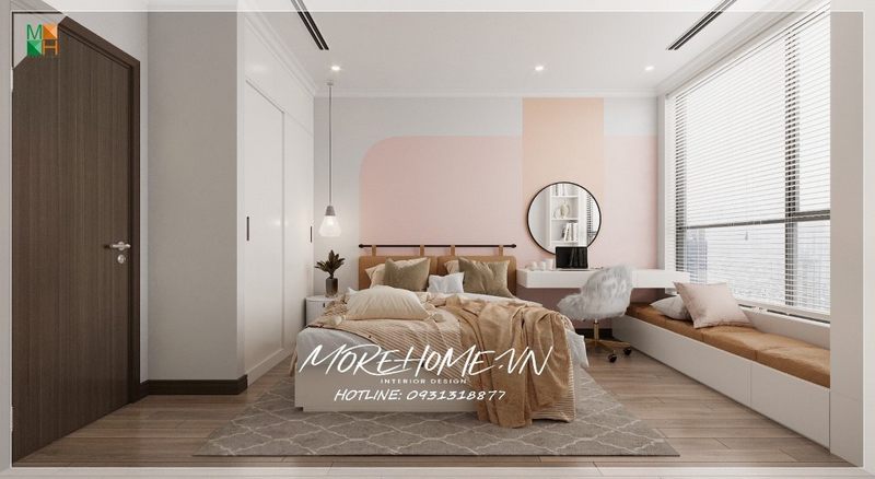 Với diện tích nhỏ của căn phòng việc sử dụng chiếc giường vuông vắn nhỏ nhắn, có màu sắc tươi sáng làm cho căn phòng ngủ chung cư hài hòa dễ chịu nhất.