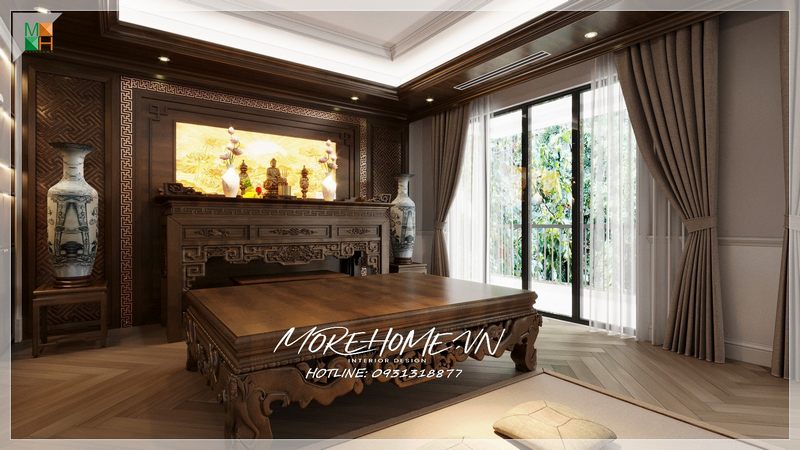 Nơi thiêng liêng nhất trong mỗi một căn nhà không thể thiếu đi được không gian phòng thờ trang trí gỗ óc chó đem lại sự ấm áp cho gian phòng và căn nhà.