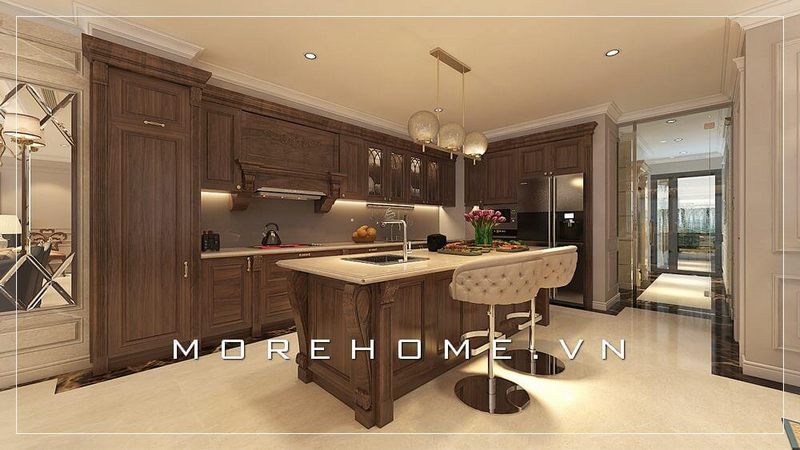 Mẫu tủ bếp gỗ tự nhiên màu nâu trầm có thiết kế cao cấp, đường nét uyển chuyển từ phong cách cổ điển, giúp không gian phòng bếp trở nên nhẹ nhàng, sang trọng và tiện nghi hơn cho người nội trợ.