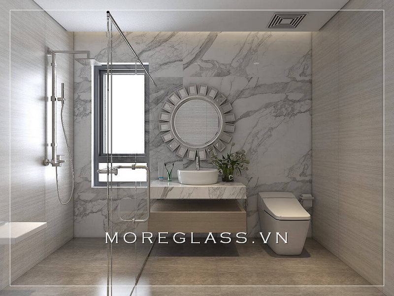 . Phòng tắm nhỏ gọn với cách bố trí nội thất hợp lí, tông màu đá ốp tường và gạch lát nền tươi sáng, giúp tạo nên không gian phòng tắm rộng rãi, cuốn hút.